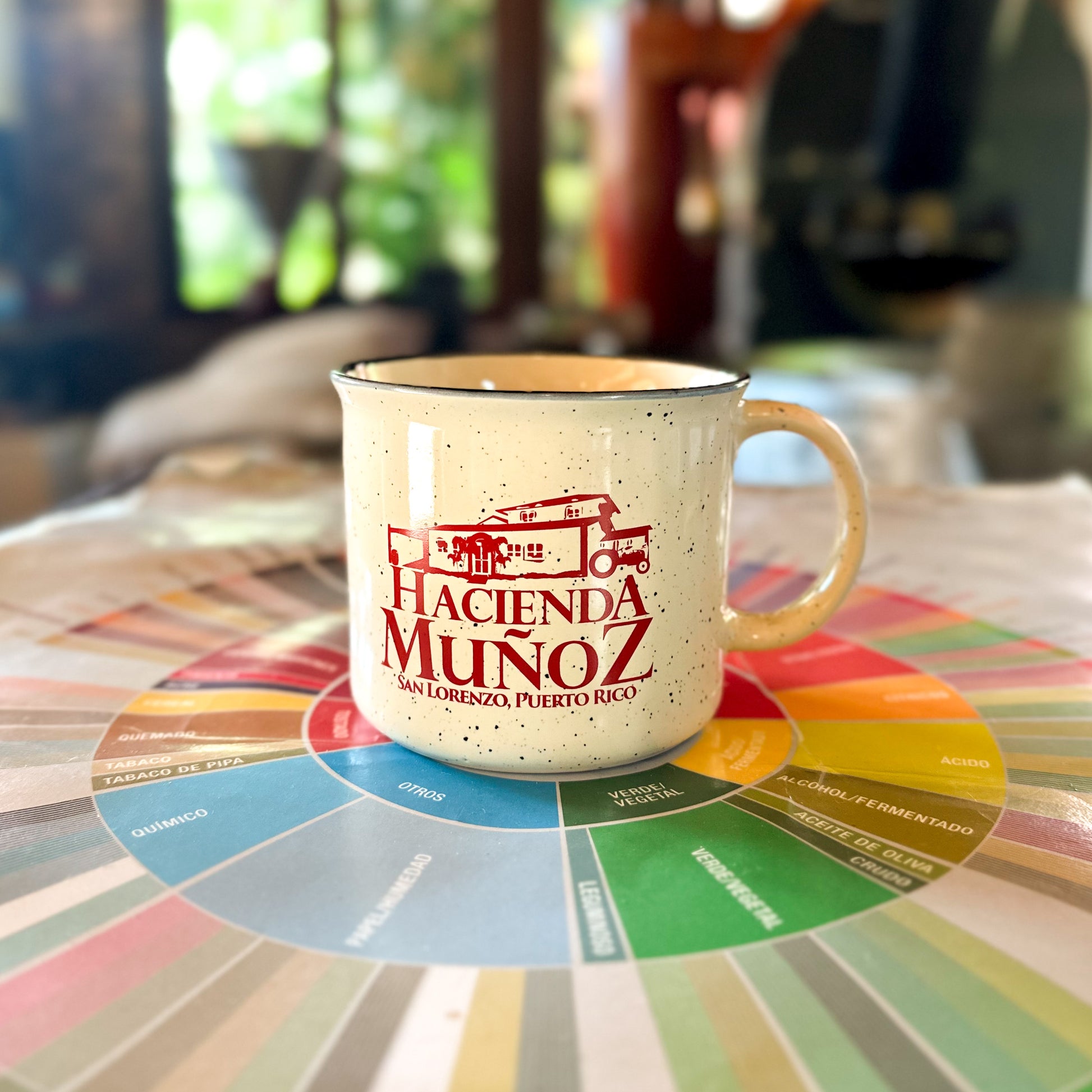 12oz ceramic mug with Hacienda Muñoz's logo in red