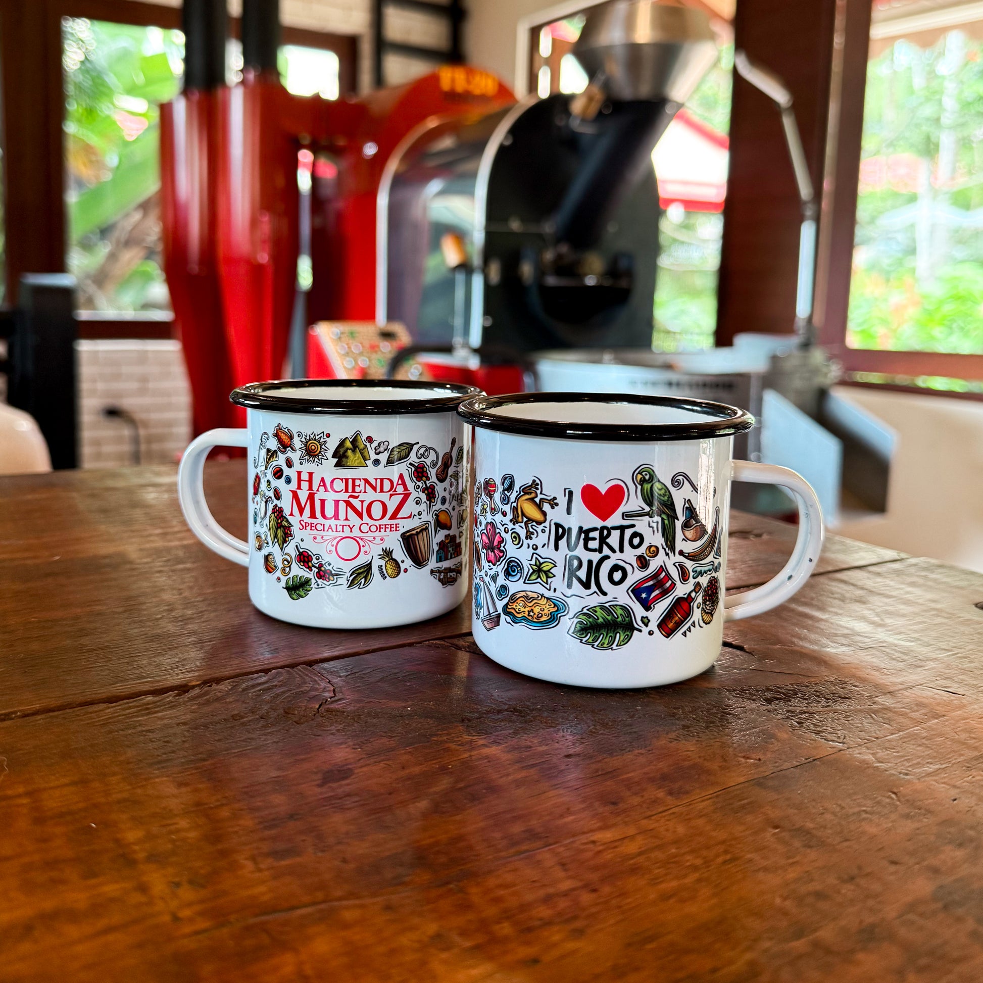 10oz white enameled mug with black edge, "I ❤️ Puerto Rico" phrase, and red Hacienda Muñoz's logo